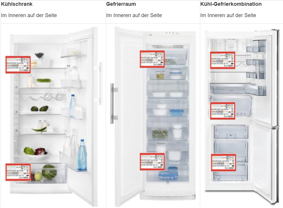 |  | Kühlschrank/Gefrierschrank: im Inneren auf der Seite - modellabhängig müssen die Gemüseschubladen entfernt werden! |  | Gefriertruhe: bei geöffneten Deckel an der Innenseite |