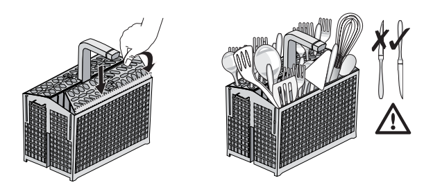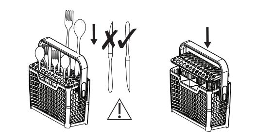 - Geben Sie Gabeln und Löffel so in den Besteckkorb, dass der Griff unten ist.