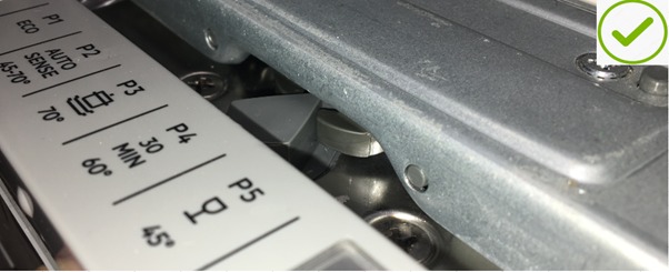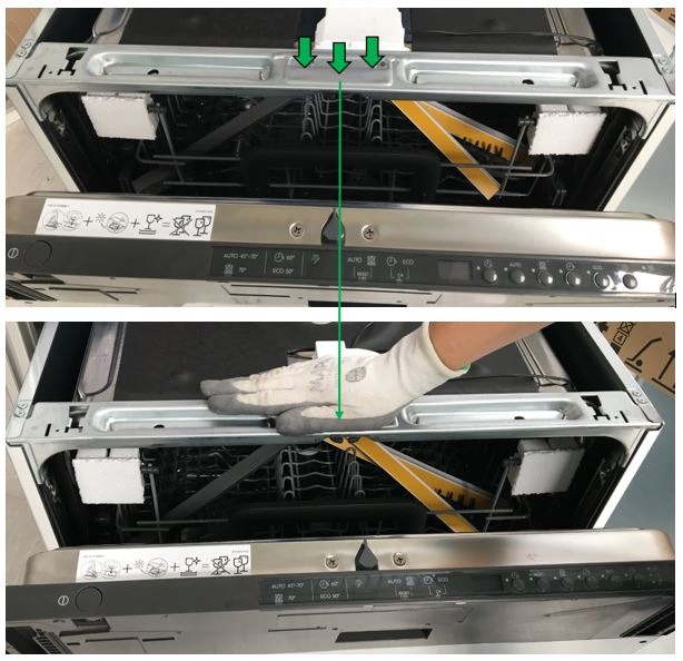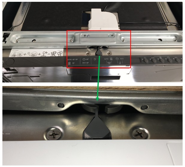 3. Öffnen Sie die Tür leicht und drücken Sie die Oberseite der Geschirrspülmaschine vorsichtig so, dass sich der diamant-förmige Keil auf Höhe des Schlosses befindet (siehe Abbildung unten).