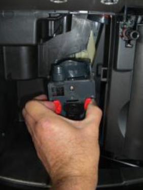 Zum Reinigen der Brüheinheit muss diese entnommen werden. Drücken Sie die beiden roten Clipse zusammen (Siehe Bild rechts) Dies ist nur möglich, wenn sich die Brüheinheit in der mittleren Position befindet. |