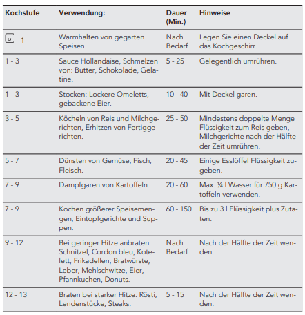 Bild 2: Beispiel aus der Bedienungsanleitung zur Verwendung der Kochstufen.