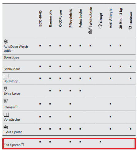 - Die Dauer der Verkürzung hängt vom Modell, dem gewählten Programm, der Beladungsmenge und der Stufe des "Zeitsparens" ab.
