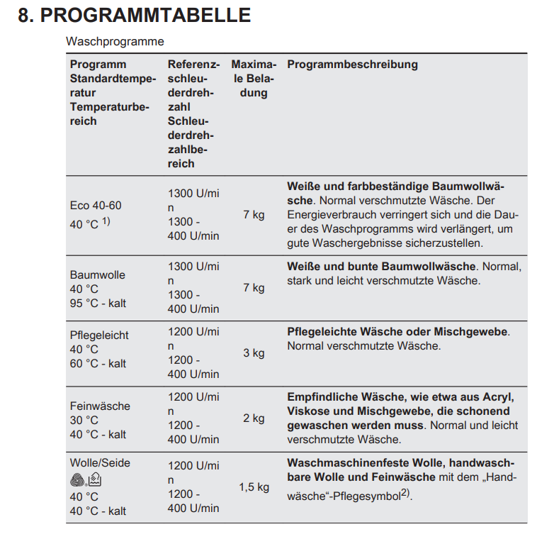 - Die Angaben beziehen sich immer auf das Gewicht der trockenen Wäsche, nicht auf das Volumen der Wäsche.