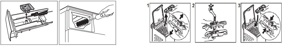 - den Waschmittelbehälter unter fließendem Wasser mit einer Bürste.