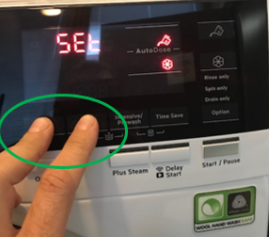 - Schalten Sie die Maschine ein und drücken Sie gleichzeitig die Sensorfelder "Temp" und "Schleudern", bis Sie "Set" auf dem Display lesen können.