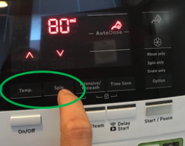 - Über die Sensorfelder "Temp" und "Schleudern" erhöhen oder verringern Sie die Menge an Waschmittel / Weichspüler
